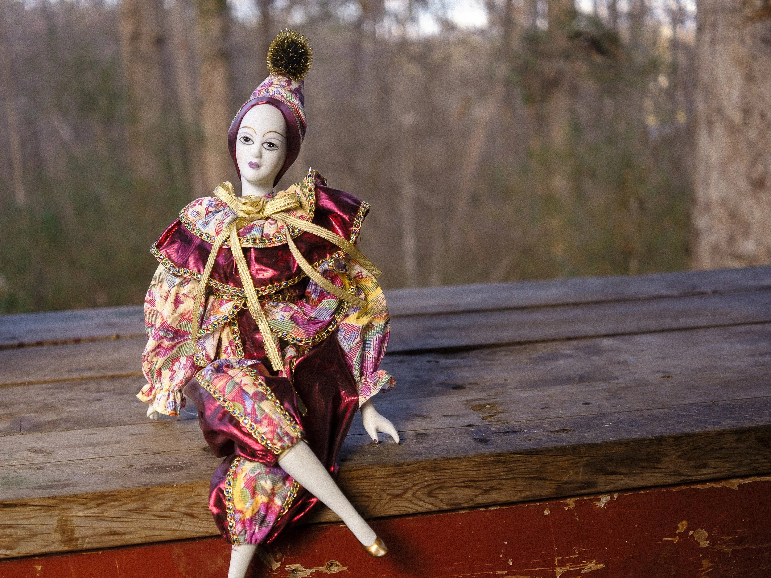 This Month is a beautiful porcelain clown wearing a rambunctious silk and polyester outfit.